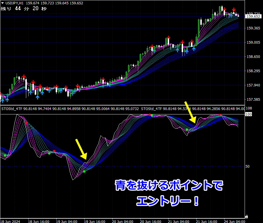 インジケーターの帯はピンク・緑・青の3層構造で、3層の帯は、収斂と拡散を繰り返しますので、 上昇時は、上から ピンク・緑・青 の並びとなり、下落時は、その逆で、上から青・緑・ピンクの並びになります。