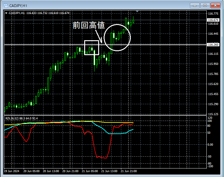 この例から、前回高値やレジサポ転換に注目したトレード手法とmBDSRの押し目買いサインとの親和性の高さがうかがえる。