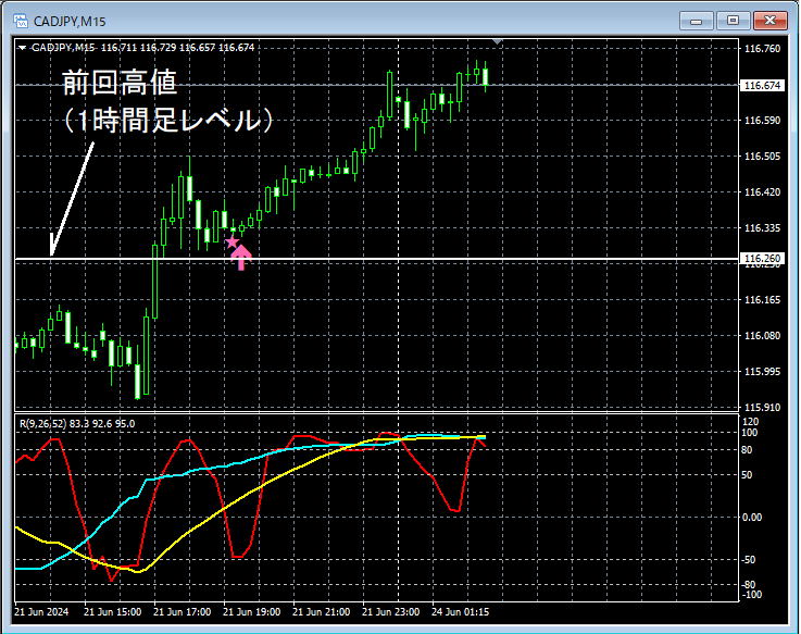 1時間足で白い円で囲ったあたりを15分足で見てみると、前回高値を示すラインを上抜けた後、そのライン付近まで下げてきたところでmBDSR(フィルター:RCI26とRCI52)の押し目買いサインが点灯して、その後プライスは順調に上昇している。