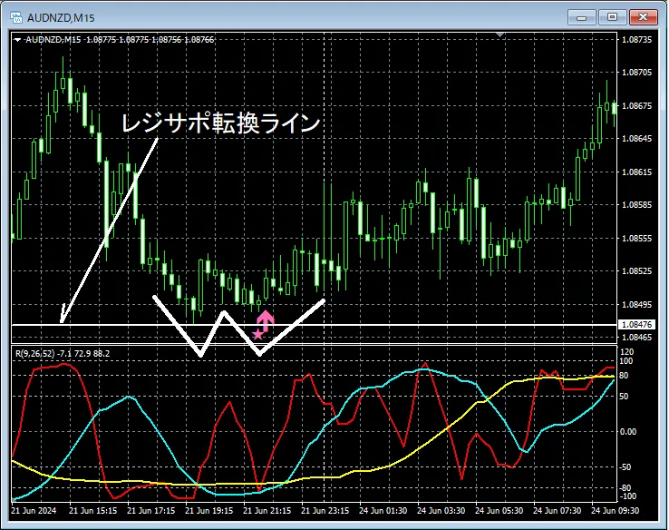 また、この例の場合、損切りラインを直近安値の少し下に置くことなどによりリスクリワードの良い優位性の高いトレードが可能である。
