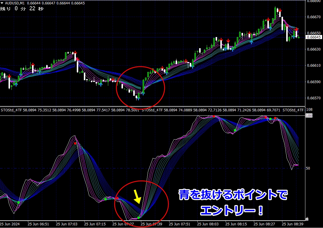 インジケーターの帯はピンク・緑・青の3層構造で、3層の帯は、収斂と拡散を繰り返しますので、 上昇時は、上から ピンク・緑・青 の並びとなり、下落時は、その逆で、上から青・緑・ピンクの並びになります。