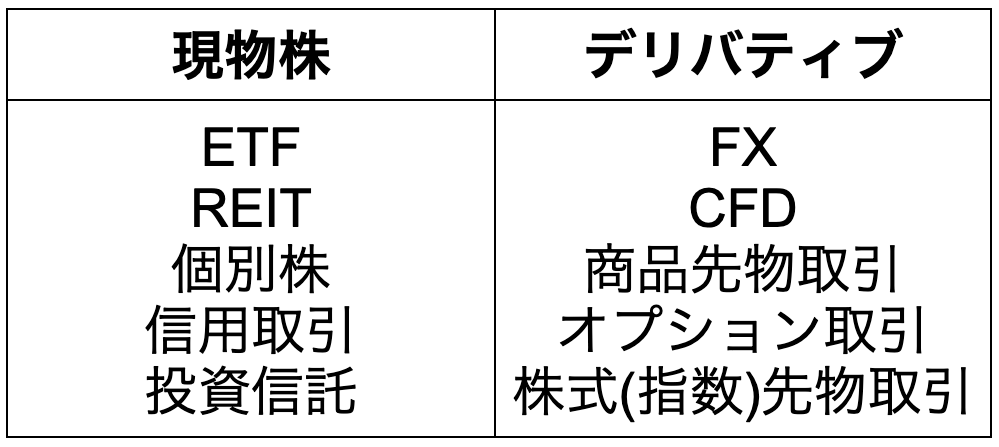 個別株、信用取引、投資信託、ETF、REIT