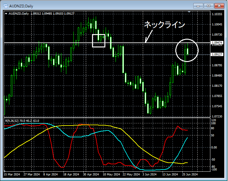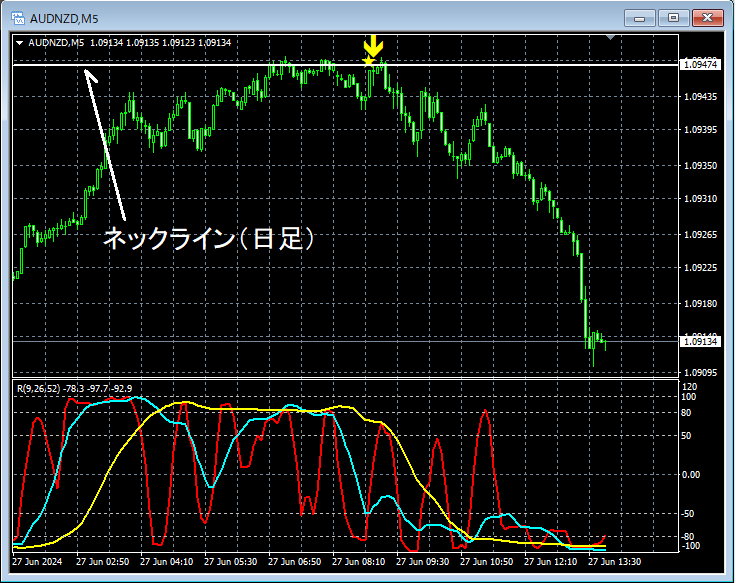 上の5分足ではネックライン(日足)付近まで上昇した後、mBDSR(フィルター:RCI26とRCI52)の戻り売りサインが点灯して下げている。