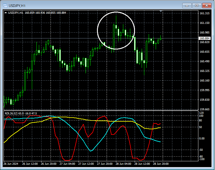 上の1時間足で白い円で囲ったあたりを見ると、161円台に乗せてきており、介入警戒感が高まりつつあると言える場面かもしれない。
