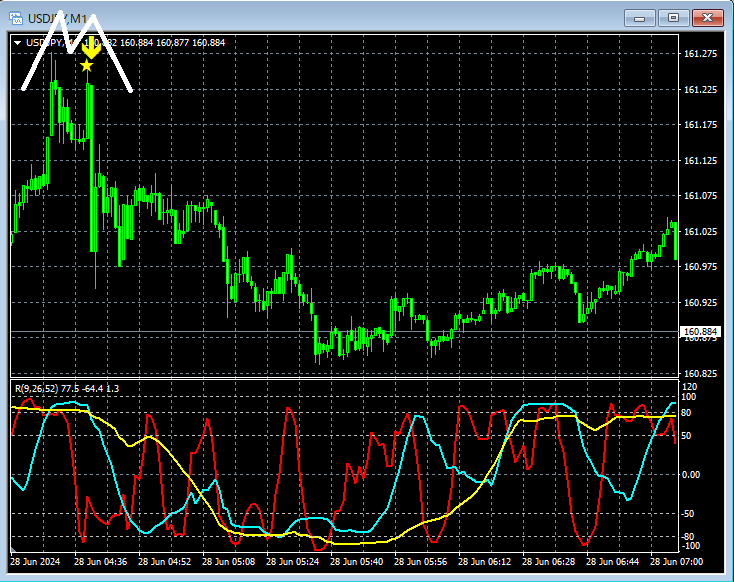 上の1分足を見てみると、ダブルトップを形成して下げていることが分かる。結果として、ダブルトップの右側の山における下げ開始のタイミングをmBDSR(フィルター:RCI26とRCI52)の戻り売りサインが上手くとらえていることが分かる。
