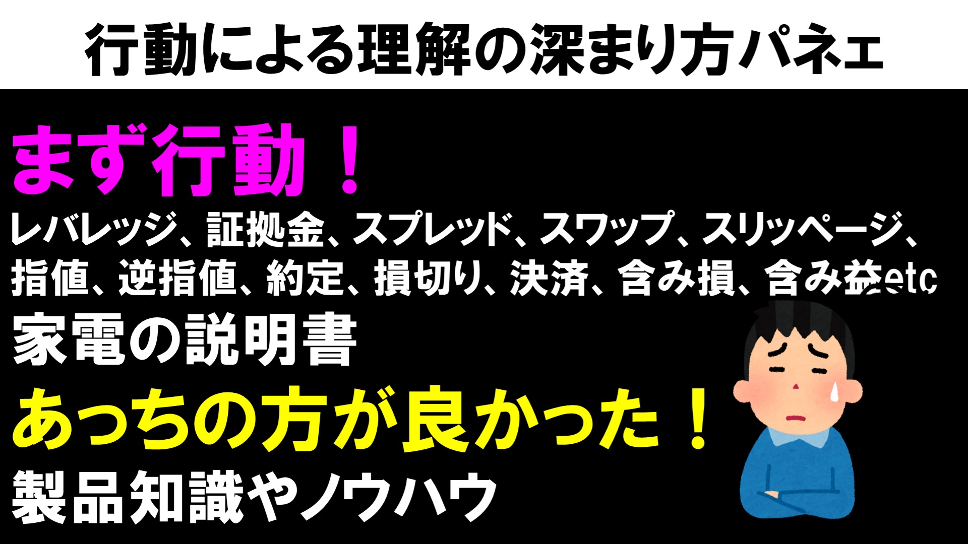 レバレッジとか証拠金、スプレッド、スワップ、スリッページ、指値、逆指値、約定、損切り、決済、含み損、含み益などなど…行動する前には知らなかった知識やノウハウが増えましたよね。