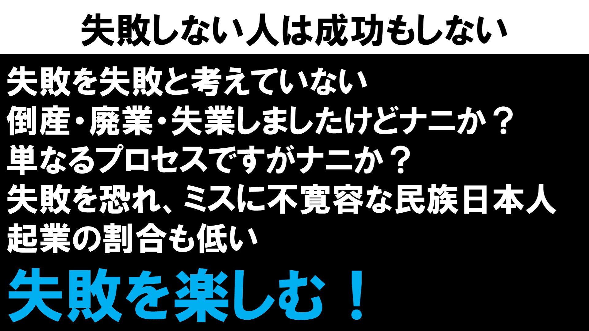 失敗を失敗と考えていないのです。会社を立ち上げて廃業にしたとしても、それは失敗じゃないのです。試してみてダメだったことを確かめた。でも分かったこともあった。じゃあ次はこうしよう。