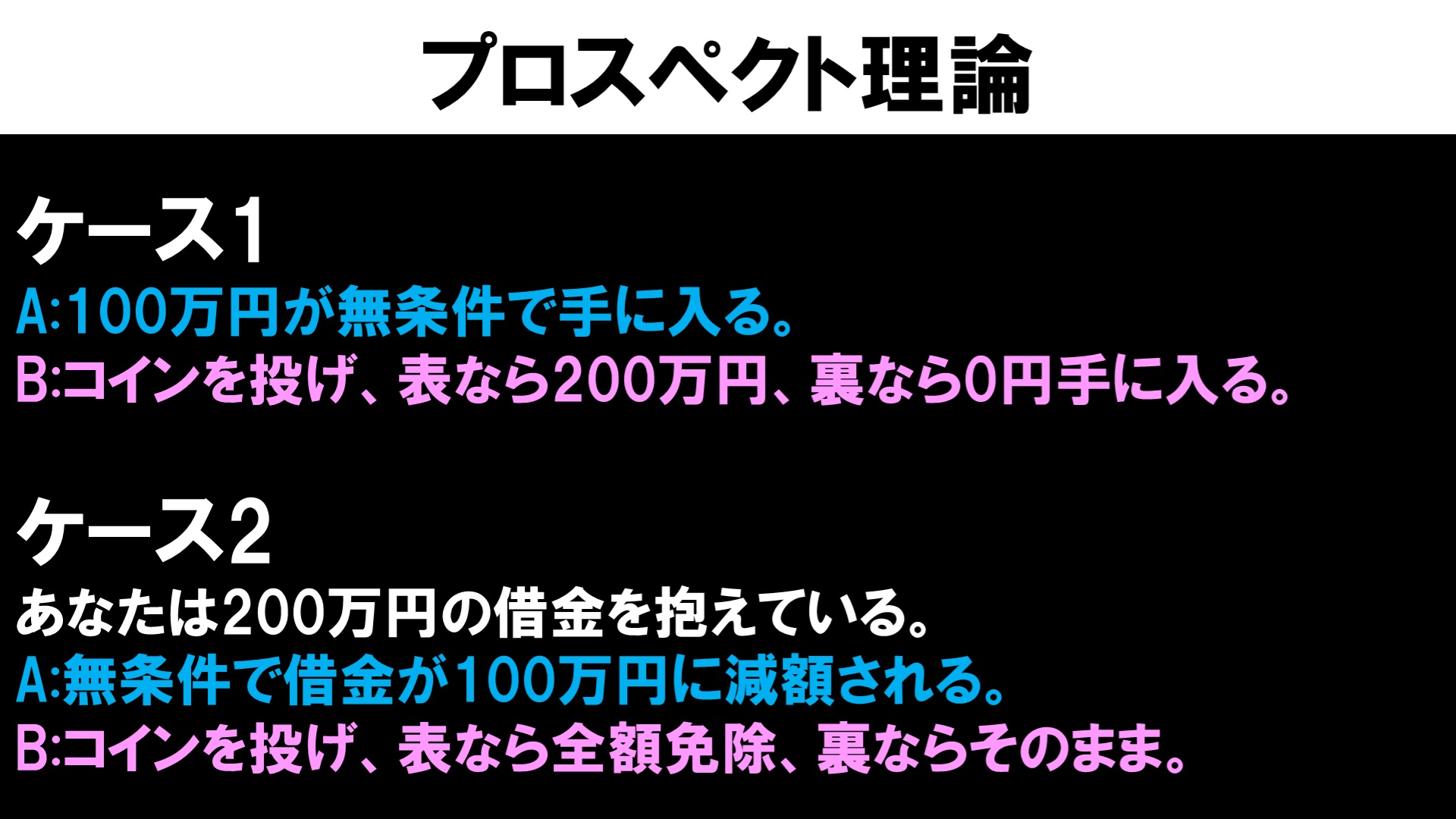 まずケース1ですが、どちらも期待値は100万円であるにも拘らず多くの被験者はAを選んだ。つまり50%の確率で何も手に入らないというリスクを回避したと。