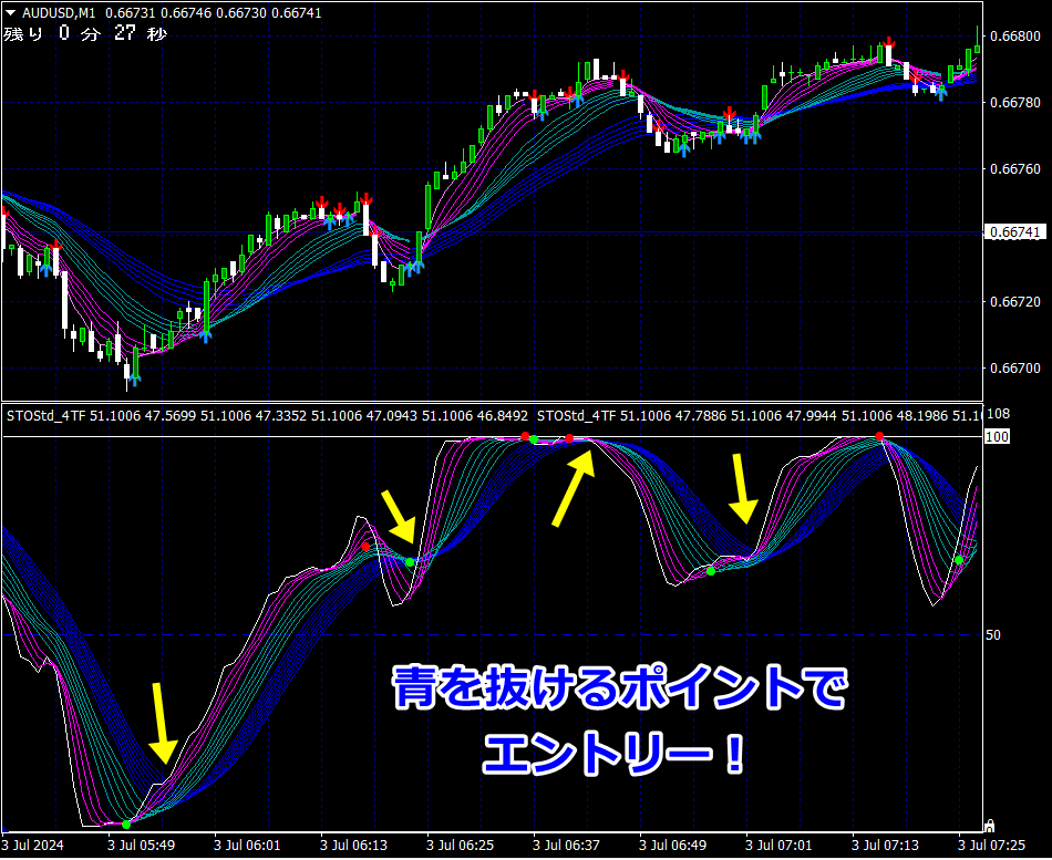 インジケーターの帯はピンク・緑・青の3層構造で、3層の帯は、収斂と拡散を繰り返しますので、 上昇時は、上から ピンク・緑・青 の並びとなり、下落時は、その逆で、上から青・緑・ピンクの並びになります。