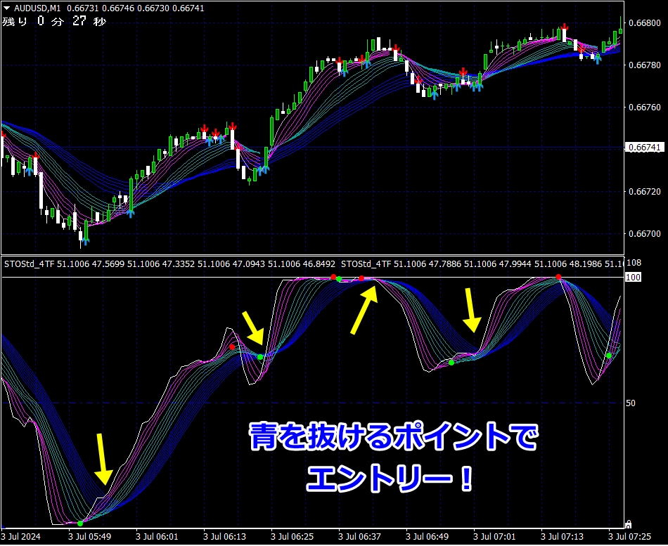 インジケーターの帯はピンク・緑・青の3層構造で、3層の帯は、収斂と拡散を繰り返しますので、 上昇時は、上から ピンク・緑・青 の並びとなり、下落時は、その逆で、上から青・緑・ピンクの並びになります。