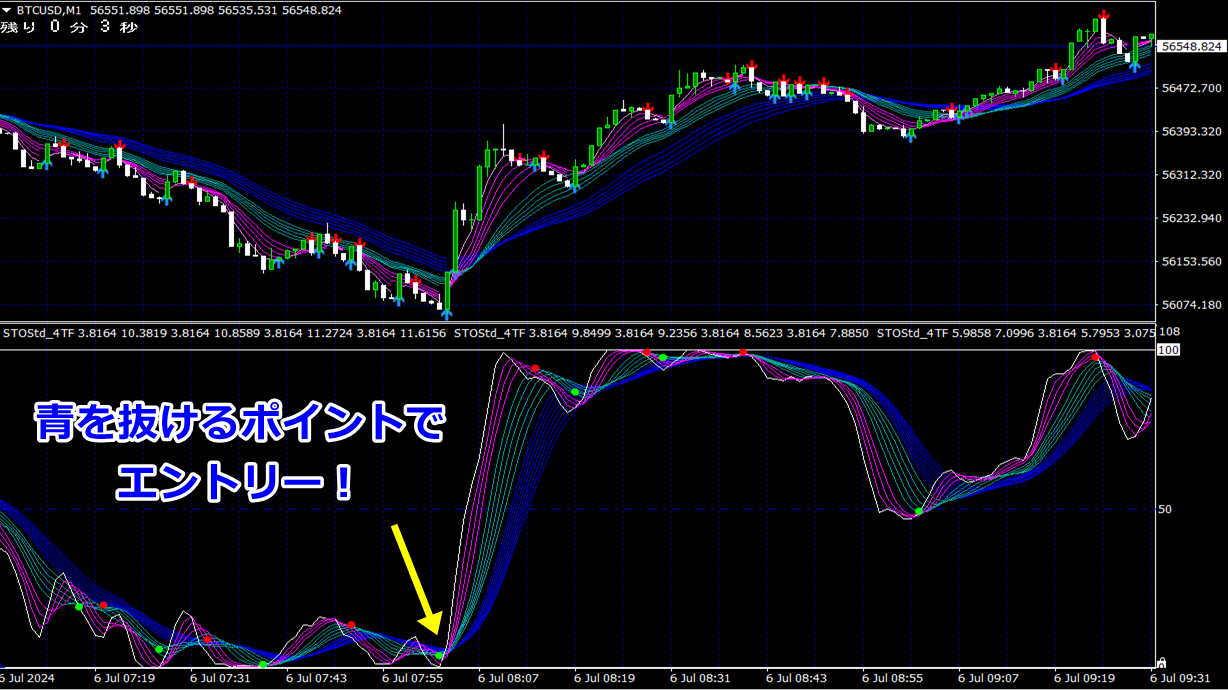 インジケーターの帯はピンク・緑・青の3層構造で、3層の帯は、収斂と拡散を繰り返しますので、 上昇時は、上から ピンク・緑・青 の並びとなり、下落時は、その逆で、上から青・緑・ピンクの並びになります。