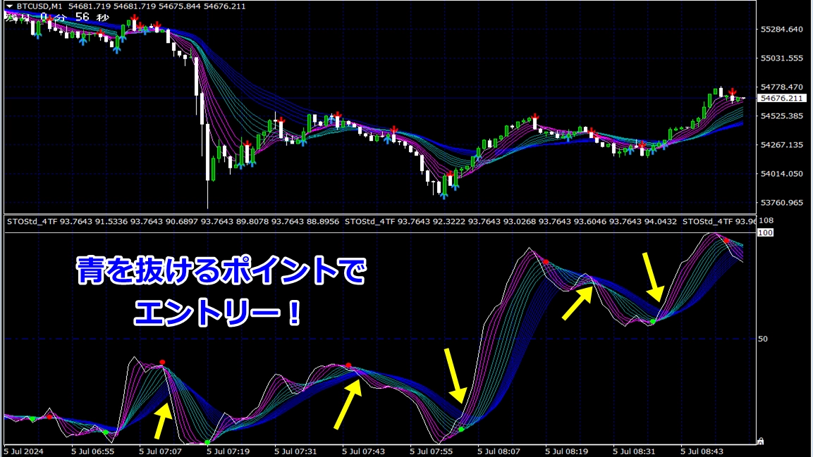インジケーターの帯はピンク・緑・青の3層構造で、3層の帯は、収斂と拡散を繰り返しますので、 上昇時は、上から ピンク・緑・青 の並びとなり、下落時は、その逆で、上から青・緑・ピンクの並びになります。