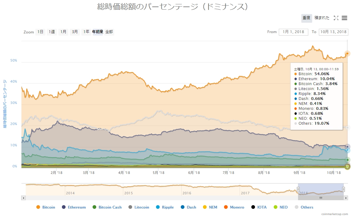 画像は2018年10月13日のキャプチャ。暴落とも呼べる大幅下落が起こった昨日とは打って変わり、「緑」が目立つ相場環境になりました。全体的に戻りの割合は小さい中、リップルは約8%の戻しとなっています。