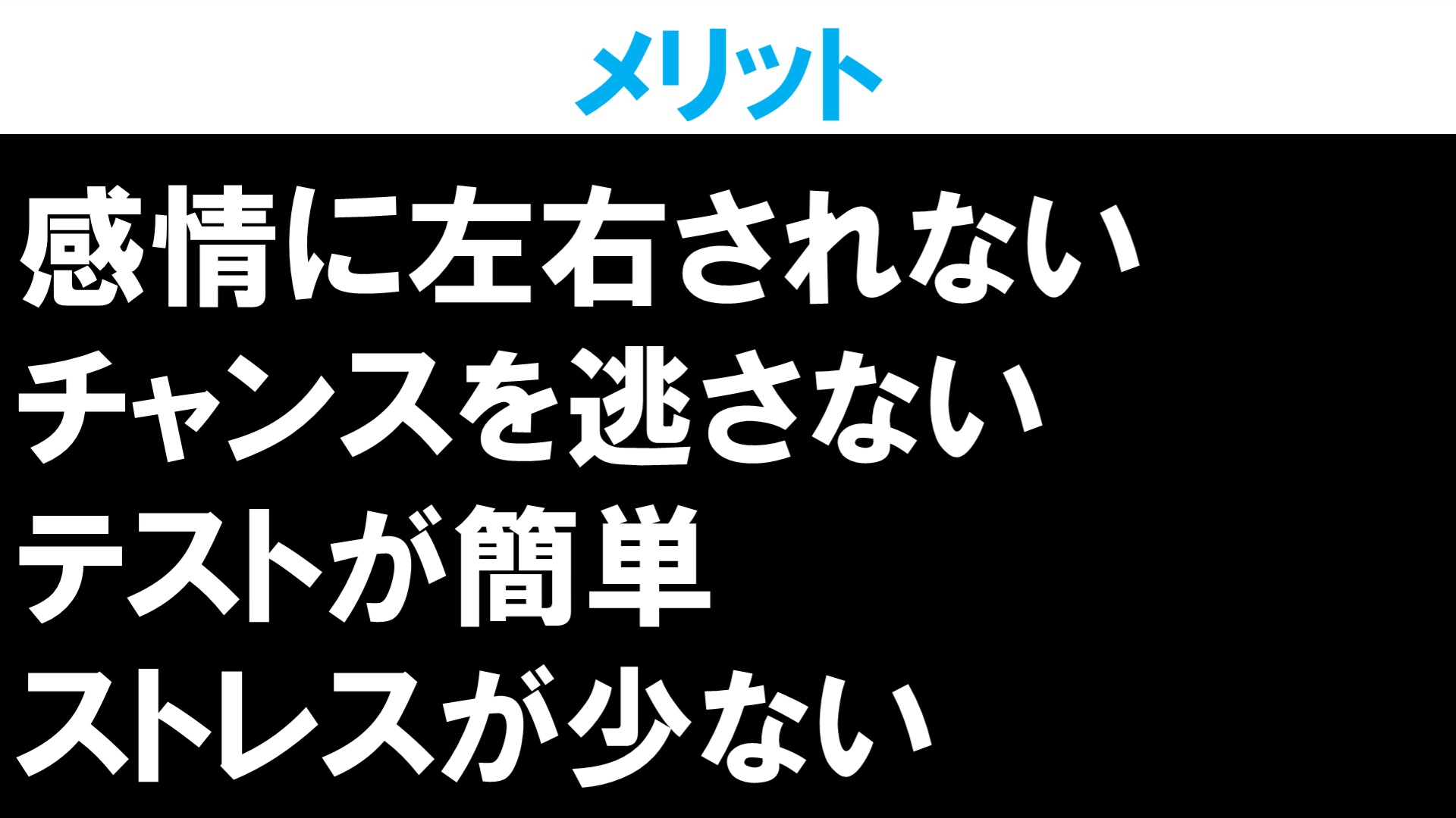 - ストレスが少ない チャートに張り付かなくていいので楽。裁量に比べストレスが少ない。結果、負けて感情的になってリベンジトレードだ!のように次のトレードに影響したりしない。