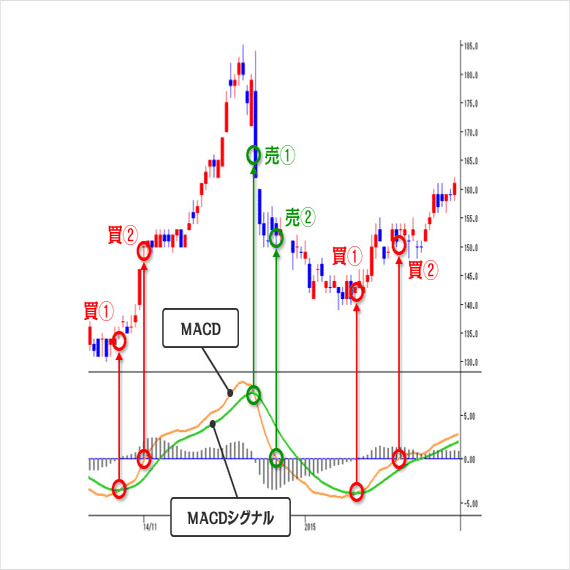 図表の買①及び、売①箇所。MACDとMACDシグナルのゴールデンクロスで買い、デッドクロスで売り。