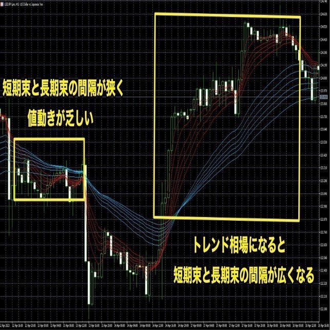 以下のチャートを見ると、トレンド相場中は短期束(赤色のライン)と長期束(青色のライン)の間隔が広くなっていきます。