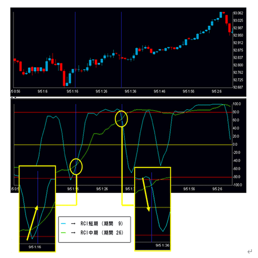 上昇トレンドを形成している場合は、短期のRCIが高い位置で反転したところが、押し目買いのポイントとなります。