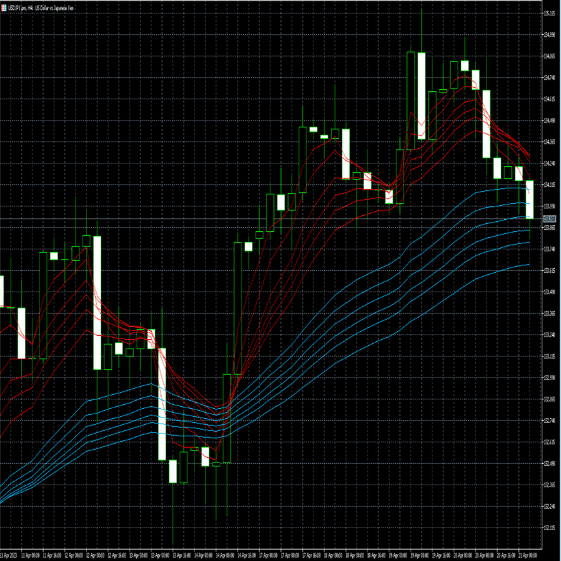 逆に強い下降トレンドでは、12本のGMMAが上から綺麗に長期から短期の順番で並びます。
