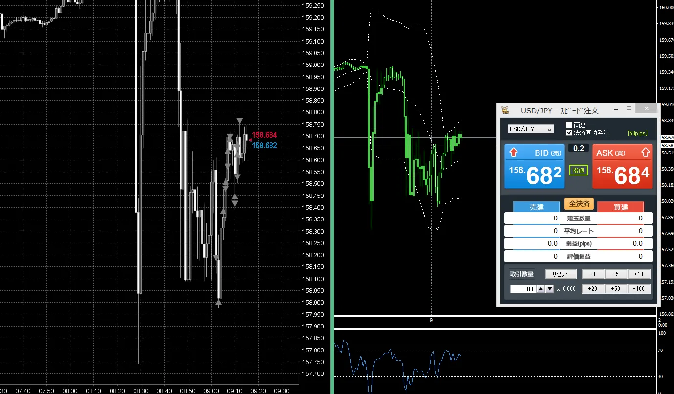 白水平線を境にチャート見ていましたが、手前乱高下のほぼ中心価格と言う事と、億トレ1分足チャート切り替え場面と言う事です。