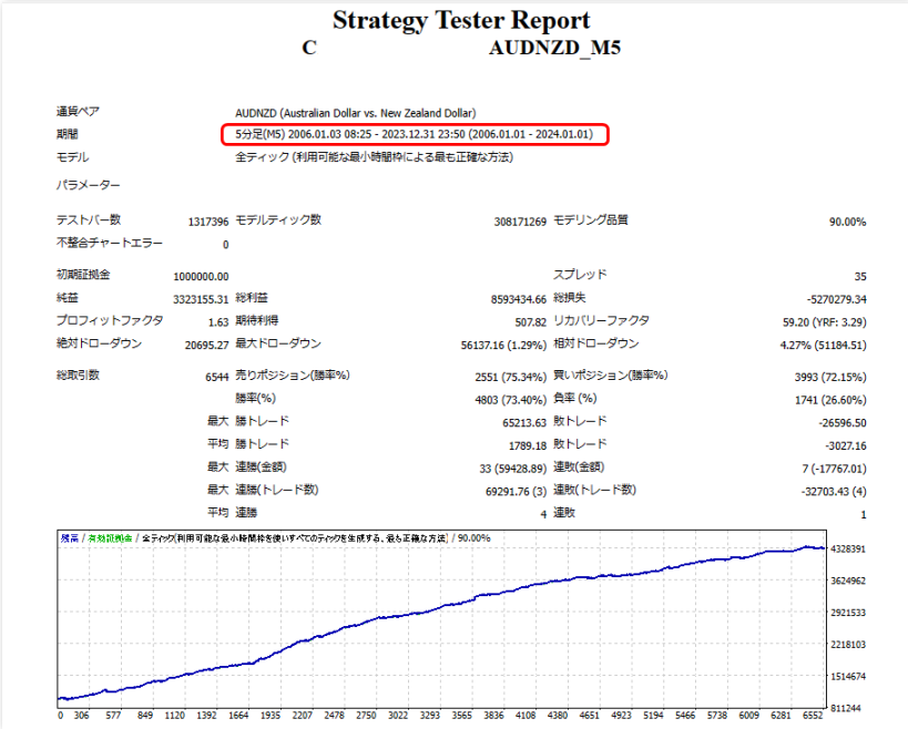 下図のEAは2006年1月から2023年12月末まででバックテストを行った例です。