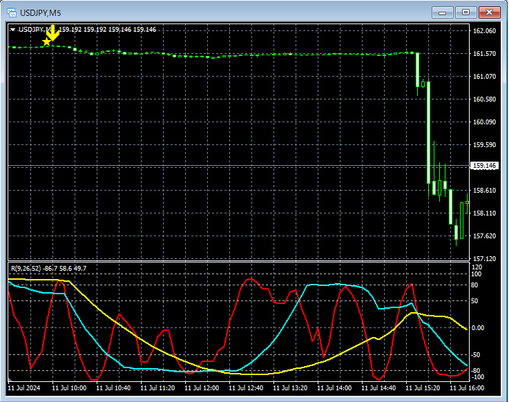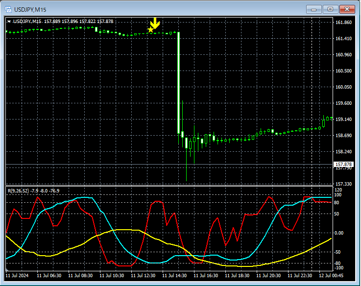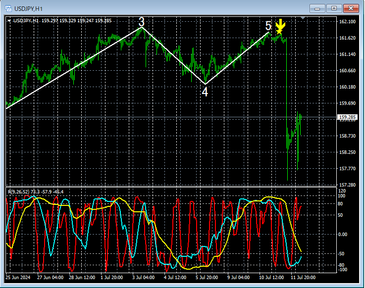 上の1時間足では、エリオット波動上昇第5波がフェイラーで終了した後にmBDSR(RCI2本フィルター)の戻り売りサインが点灯し、米CPI発表後に大きく下げている(為替介入があったかもしれない)。