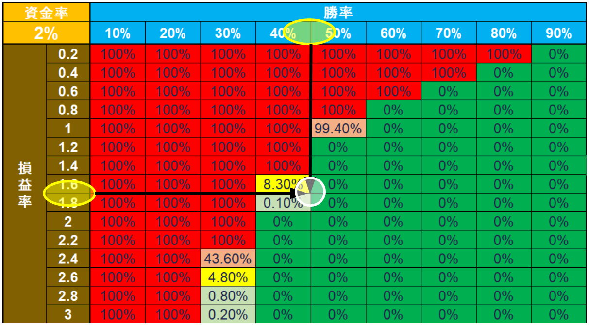 勝率をと損益率ともに掲載数値の間となるのでその周辺4つの数値を全て足して4で割ってみます。