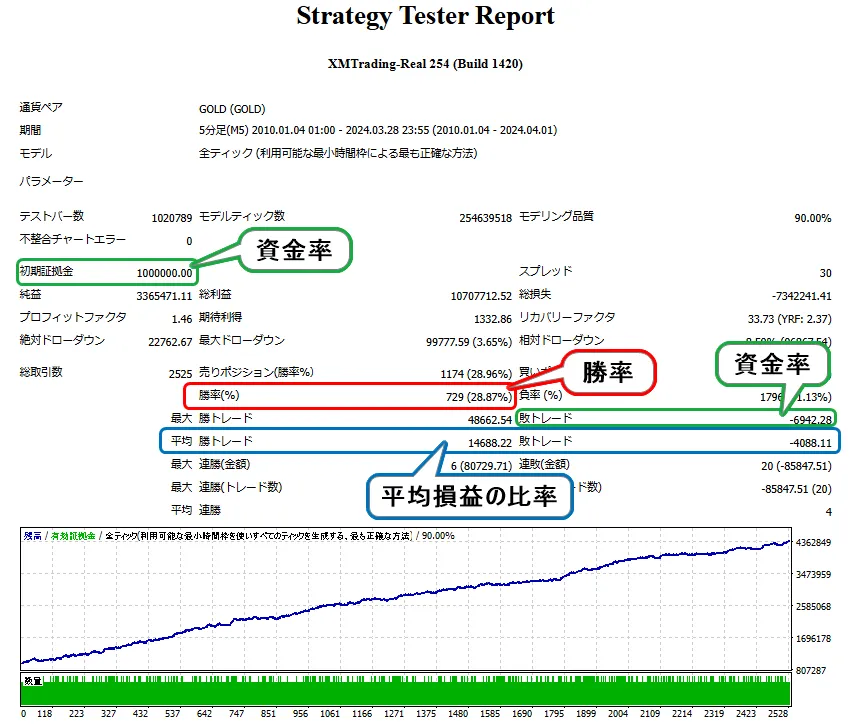 このようにバックテストレポートの情報だけでなく、裁量取引のように手法のひとつとして分析をすることで様々な側面からEAを分析できるようになります。