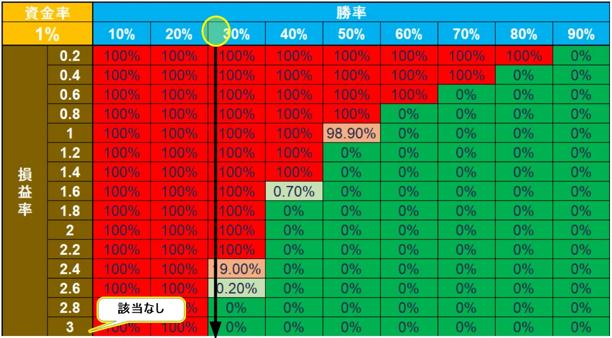 勝率は30%に程よく近いところを参照するとして、損益率がよすぎるためバルサラの破産確率表に掲載されている損益率を超えてしまっています。