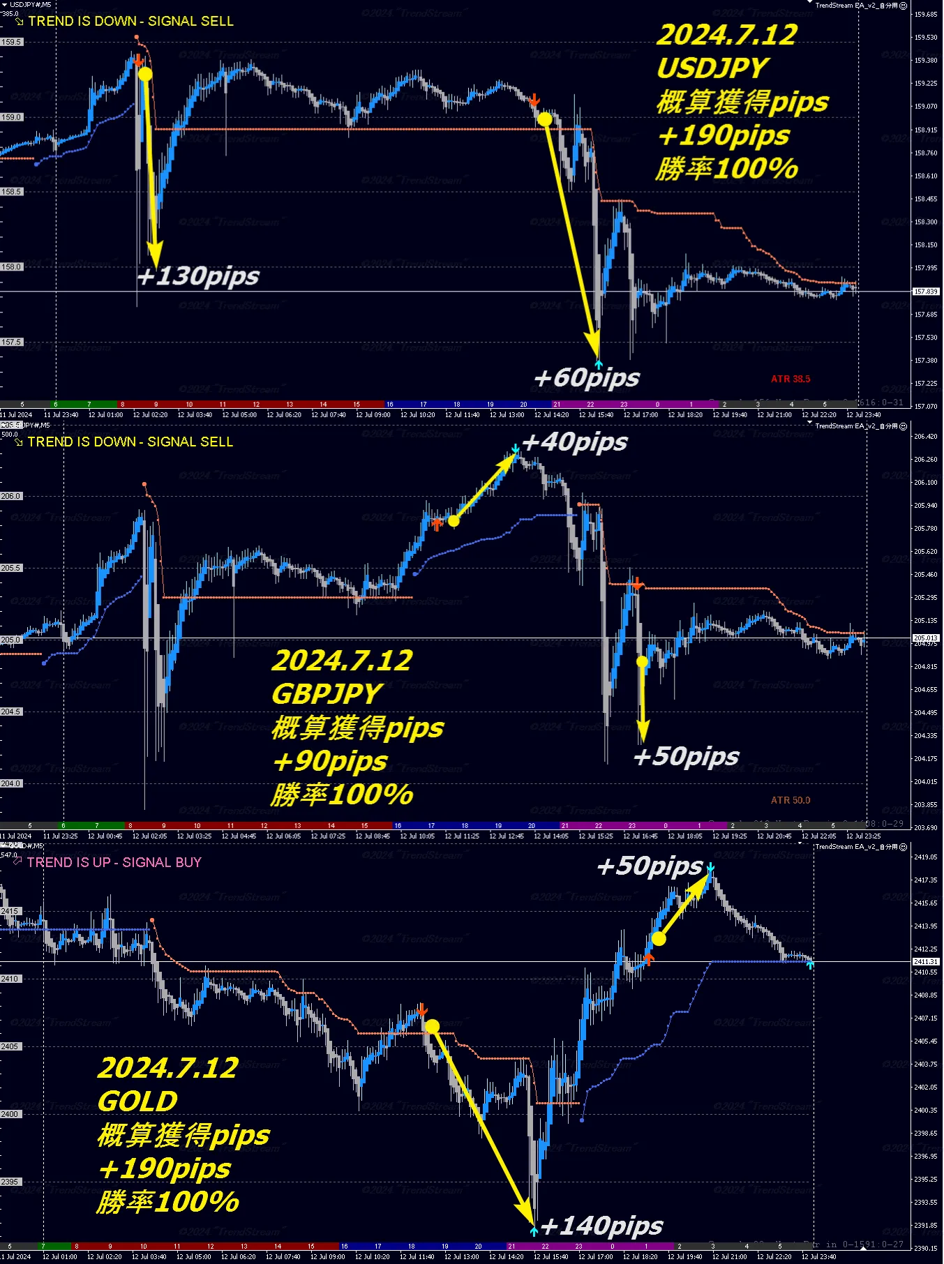 裏技5分足デイトレ USDJPY +190pips / GBPJPY +90pips / GOLD +190pips 2024.7.12『過去検証結果』7.15(月)まで ”TrendStream” 新規ご購入特典キャンペーンで決済用トレールEAが無料特典に!