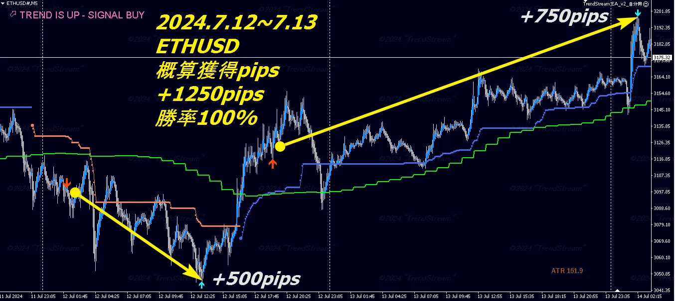 暗号資産で裏技5分足デイトレ ETHUSD +1250pips 『過去検証結果』7.15(月)まで ”TrendStream” 新規ご購入特典キャンペーンで決済用トレールEAが無料特典に!