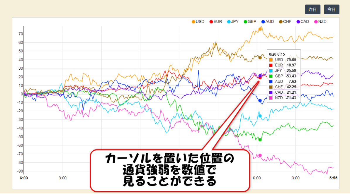 通貨強弱は2か国間の通貨価値の差を見ています。