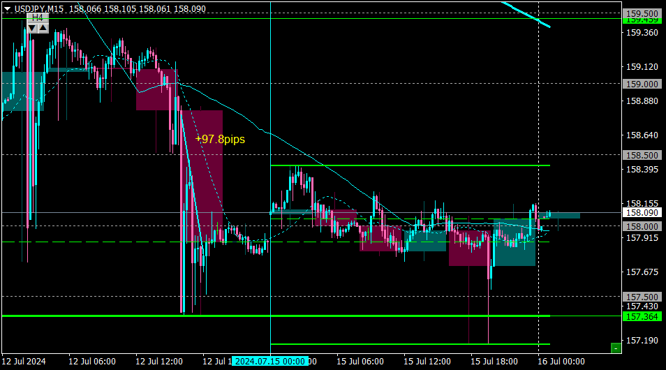 〇前日のトレード・USDJPY ドル円(15分足)先週の金曜は、強いと思われたサポート150.50を割り込んできたので、シナリオ変更しショート。ロング勢の損切りも巻き込んで大きく下げた。+71pips