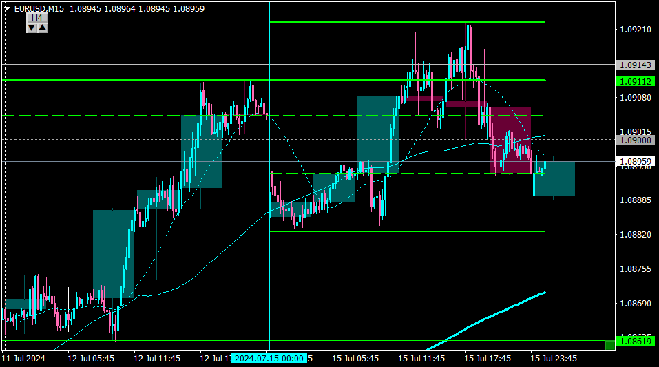 〇前日のトレード・USDJPY ドル円(15分足)昨日は先週安値141.50付近での値動きにとどまったためノートレード。・EURUSD ユーロドル(15分足)昨日は1.090付近でのプライスアクション
