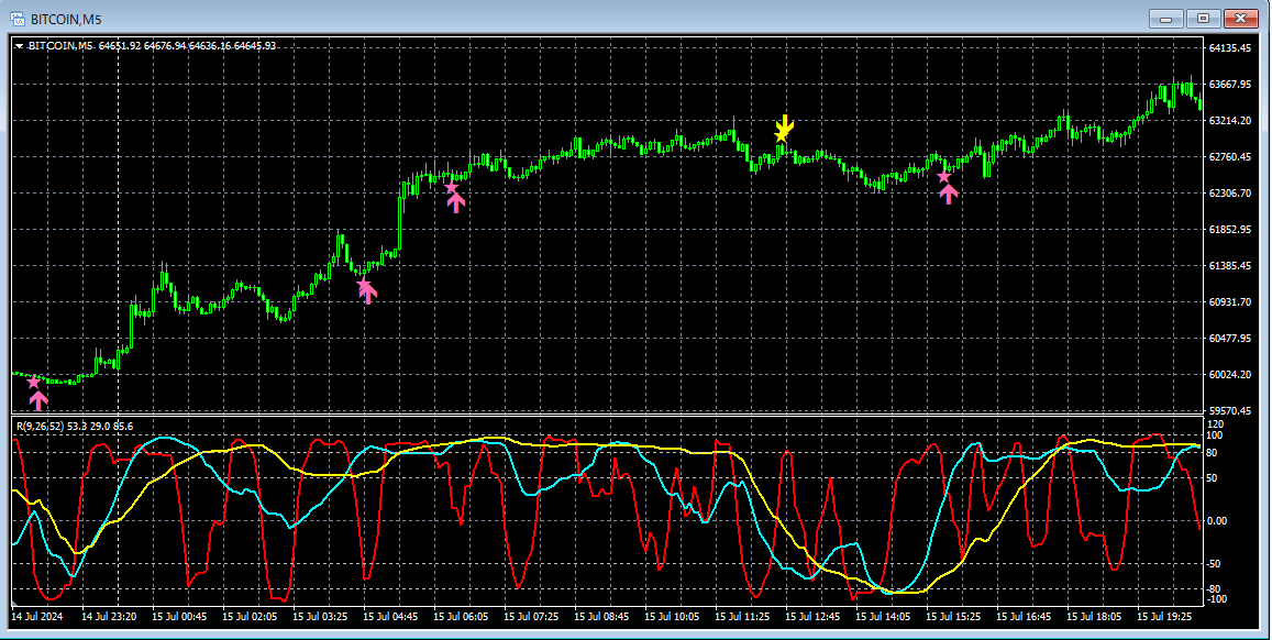 上の5分足における矢印サインは、mBDSR(フィルター:RCI26とRCI52)の押し目買いサインと戻り売りサインです。