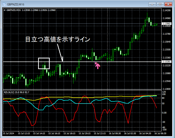 この例から、過去の目立つ高値に注目したトレード手法とmBDSRのサインとの親和性の高さがうかがえる。