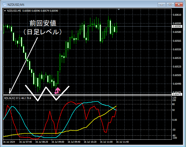 上の5分足では、日足レベルの前回安値付近まで下げてきたところでダブルボトムを形成して上昇している。そのダブルボトムの右側の谷でタイミングよくmBDSR(フィルター:RCI26とRCI52)の押し目買いサインが点灯している。