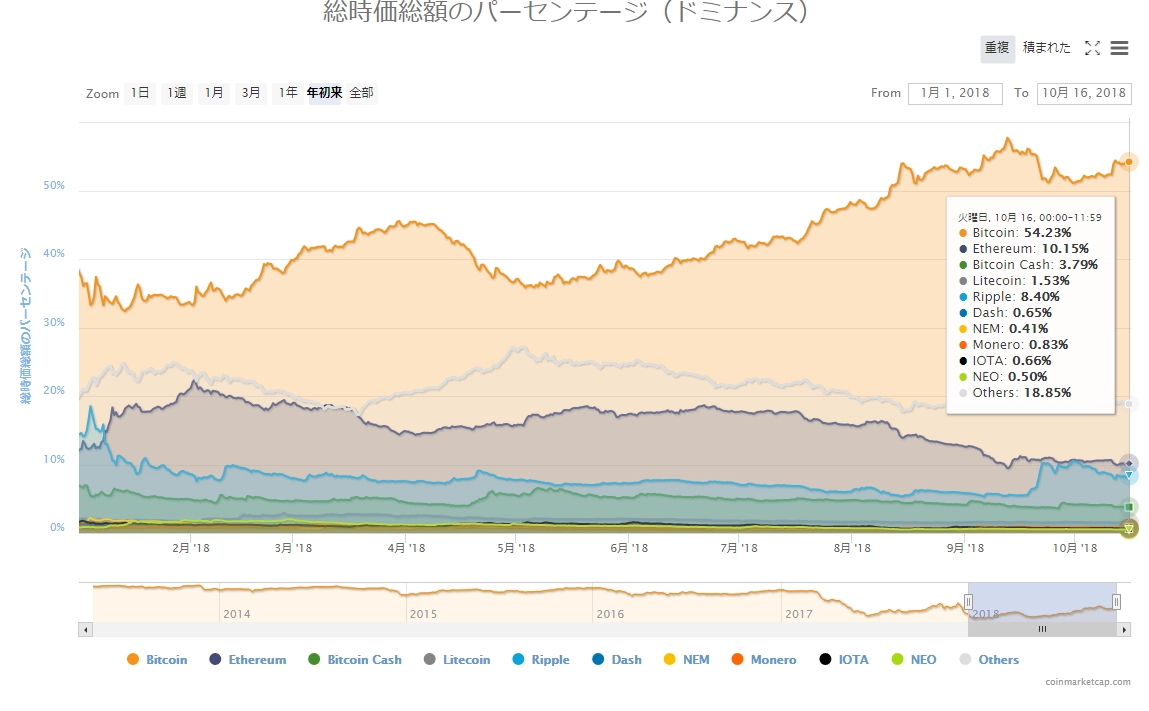 画像は2018年10月17日のキャプチャ。昨日は調整の「緑」から一転し、下落の「赤」に切り替わったところでしたが、今日は全面的な「緑」にV字回復しています。ビットコイン、ビットコインキャッシュ、ライトコインは約5%、イーサリアムは約7%、リップルは約10%の回復です。