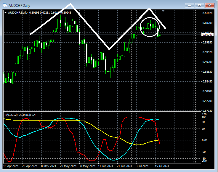 ここでは、日足でダブルトップが形成される可能性があることも意識しつつ、白い円で囲ったあたりをさらに下位足で詳しく見てみることにする。