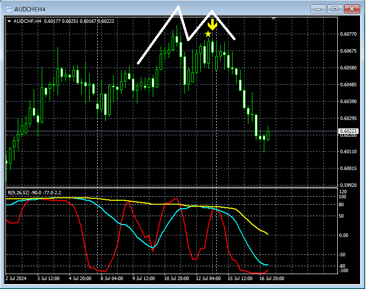 また、この例では、損切りラインを4時間足のダブルトップの左側の山(直近高値)の少し上に置くことなどによりリスクリワードの良いトレードが可能である。