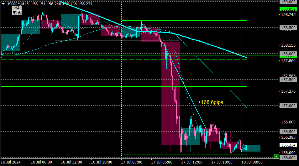 昨日はネックライン158.26から上昇しかけたが、夕方にこの節目を割ったのでショートエントリー。大きく下げて下げ止まったところでイグジット。+168.6pips