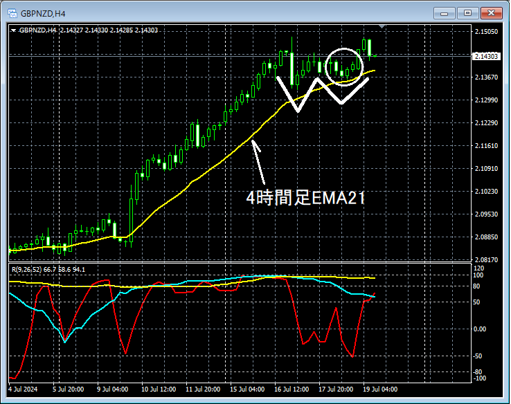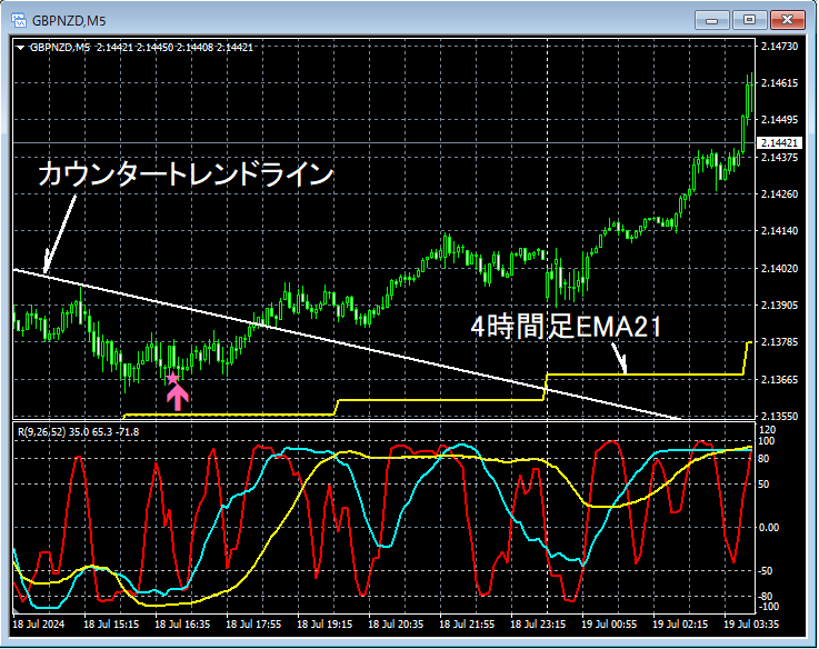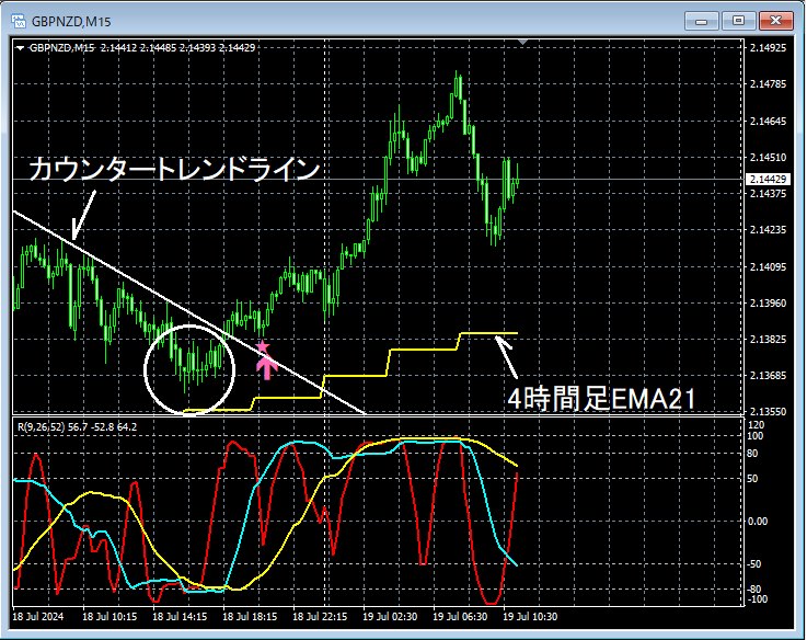 上の15分足を見ると、4時間足EMA21付近まで下げてから反発。カウンタートレンドラインを上抜けした後の下げで、mBDSR(フィルター:RCI26とRCI52)の押し目買いサインが点灯して大きく上昇している。