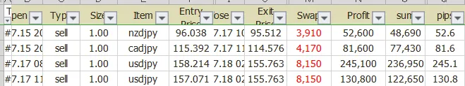 執筆を開始した5月~7月19日現在までのフォワード計測結果は、1ポジション10万通貨で純利益約252万、獲得Pips2,338pips、PF2.6、勝率71.3%(日経平均やゴールドなどのCFD取引で言えば23,380pipsに相当)
