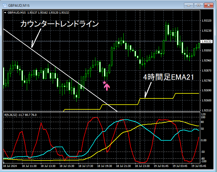 上の15分足を見ると、4時間足EMA21付近まで下げてから反発。カウンタートレンドラインを上抜けした後の下げで、mBDSR(フィルター:RCI26とRCI52)の押し目買いサインが点灯して大きく上昇している。