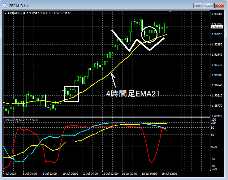 また、この例では、直近安値の少し下に損切りラインを置くことなどによりリスクリワードの良いトレードが可能である。