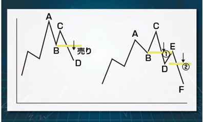 下図 右①:CがAの高値更新をするも、DがBを下抜けたタイミング(未確定)