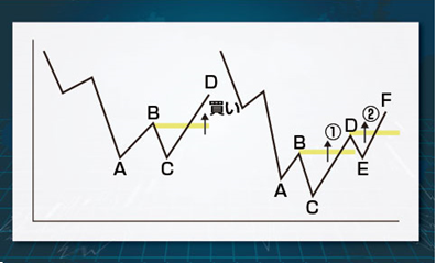 下図 右①:CがAの安値更新をするも、DがBを上抜けたタイミング(未確定)