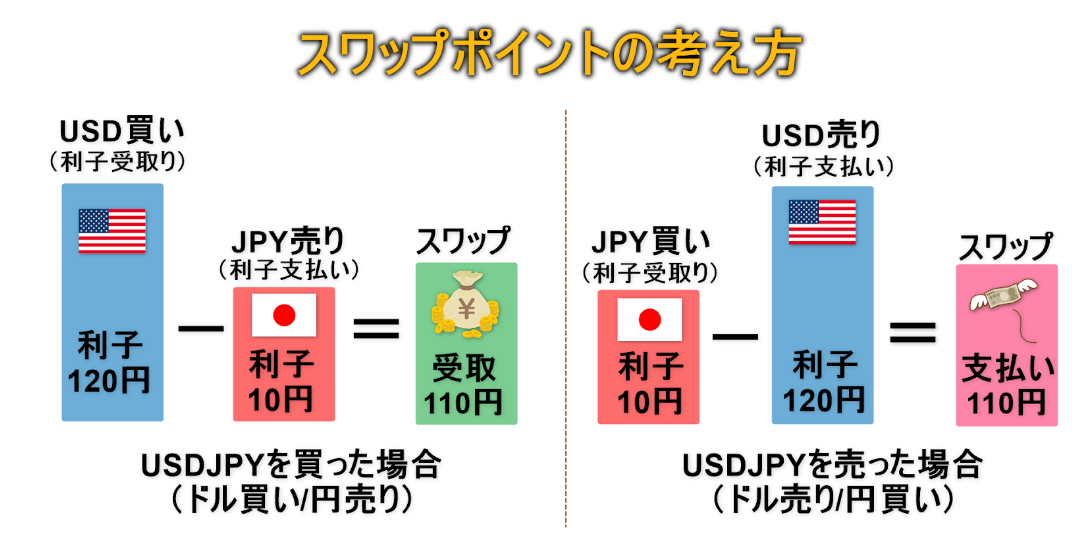 その差が「マイナス110円」となり、スワップ金利として110円の支払いとなるのです。