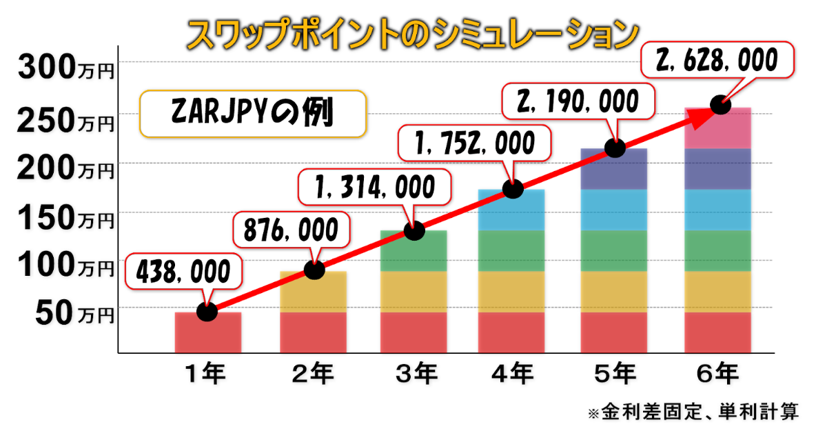 先程シミュレーションしたZARJPY(南アフリカランド/日本円)は買い方向の場合にプラスのスワップ金利でした。