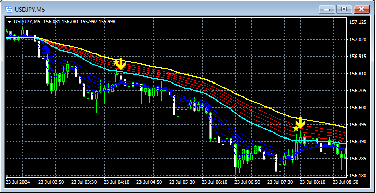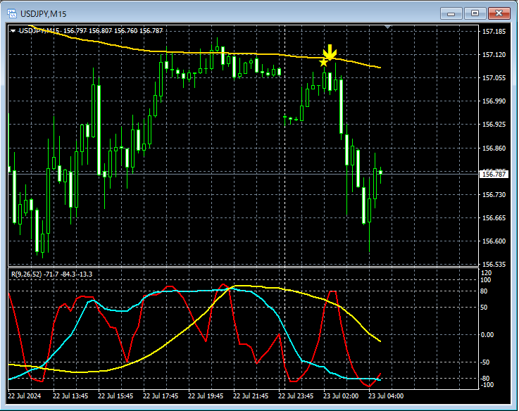 【本日のドル円攻略】トレンド転換をとらえトレンドを追いかける mBDSR(RCI2本フィルターとMA2本フィルター)の役割分担 2024年7月23日