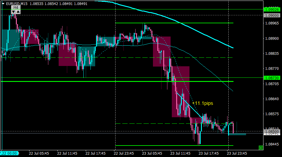 次の節目1.0850の下げ止まりでイグジット。+11.1pips